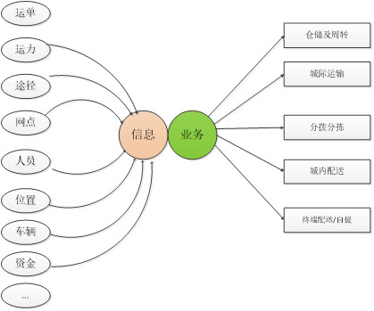 從(cóng)電(diàn)商與物(wù)流快(kuài)遞業(yè)務上(shàng)來(lái)說(shuō),其信息π主要(yào)包含了(le)物(wù)流、信息流、資金(jīn)流,其業(yè)務主要(yào)包含了(le)倉儲周轉發出、城(chéng)際間 (jiān)運輸、分(fēn)撥分(fēn)揀、城(chéng)市(shì)內(nèi)配送、終端配送/自(>zì)提等環節,因此在每個(gè)環節都(dōu)會(huì)包含了(le)以上(shàng)的(de)信息,通(tōng)過以業(yè)務為(wèi)邊界将包含在與φ該業(yè)務相(xiàng)關的(de)所有(yǒu)信息進行(xíng)整合,作(zuò)為(wèi)統一(yī)資源管理(lǐ)和(hé)服務的(de)基礎,并采用(yòn∑g)智能(néng)分(fēn)析、合理(lǐ)規劃、業(yè)務預測模型對(duì)其配送服務資源進行(xíng)合理(lǐ)安排和(hé)對(duì)外(wài)提供服務₽。其下(xià)圖是(shì)信息和(hé)業(yè)務的(de)概述圖: