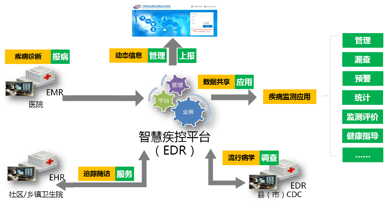基于EDR實現(xiàn)報(bào)病在醫(yī)院,管理(lǐ)在疾控、服務在社區(qū)的(de)高(♣gāo)效、快(kuài)捷業(yè)務協同模式。