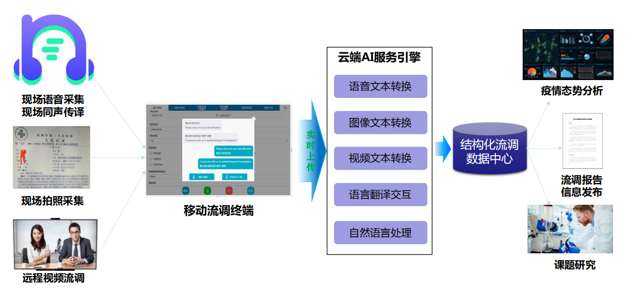 通(tōng)過移動端采集音(yīn)頻(pín)、視(shì)頻(pín)、照(zhào)片等文(wén)件(jiàn),充分(fē↔n)依托AI智能(néng)技(jì)術(shù),将非結構化(huà)文(wén)件(jiàn)轉換為(wèi)标準結構化(huà)的(de)流行(xíng)病學調查數(shù)據σ,為(wèi)一(yī)線流調人(rén)員(yuán)提供智能(néng)化(huà)流調數(shù)據采集助手,并提供現(xiàn)場(chǎng)同聲傳譯服務,方便對(duì)境外(w≠ài)人(rén)員(yuán)開(kāi)展流行(xíng)病學調查,支持遠(yuǎn)程視(shì)頻(pín)流調,避免流調人(rén)員(yuán)與患者接觸。