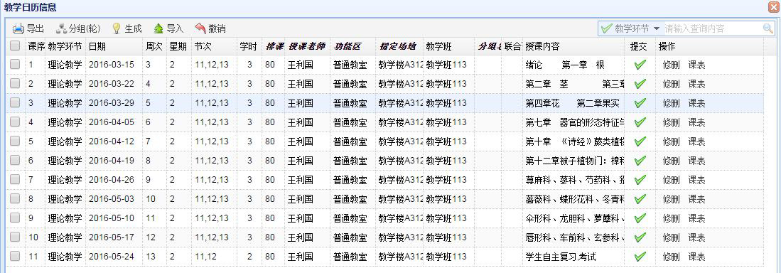 教學日(rì)曆表,完全遵循教學安排管理(lǐ)流程,使教學管理(lǐ)工(gōng)作(zuò)從(cóng)以往的(de)“課程”≈管理(lǐ)延伸到(dào)了(le)“課堂”管理(lǐ),為(wèi)教、學、管理(lǐ)一(yī)體(tǐ)化(huà)信息系統構建提供了(le)堅實的(de)數(shùΩ)據支撐。