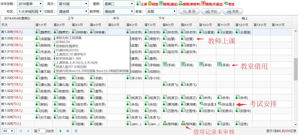 如(rú)下(xià)圖中顯示各類教室使用(yòng)情況,包括上(shàng)課使用(yòng)、借用(yòng)、考試使用(yòng)、鎖定等所有(yǒu)使用(yòng)情況®: