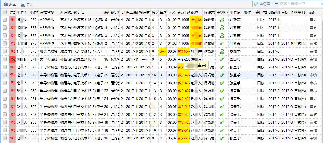 如(rú)下(xià)圖:教師(shī)在線申請(qǐng)調課、停課、補課,完成審核流程後實時(shí)更新課表