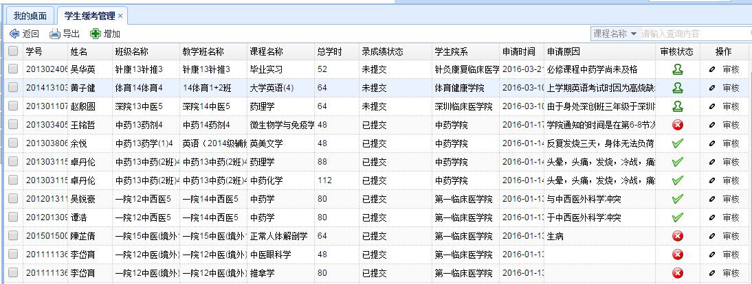 業(yè)務辦理(lǐ):緩考申請(qǐng)、免修申請(qǐng)、成績複核、教材選訂、課外(wài)課題申報(bào)、創新學分(fēn)申請(qǐng)、↔信息變動申請(qǐng)、學籍異動申請(qǐng)、休退學申請(qǐng)、預警解除申請(qǐng)等。