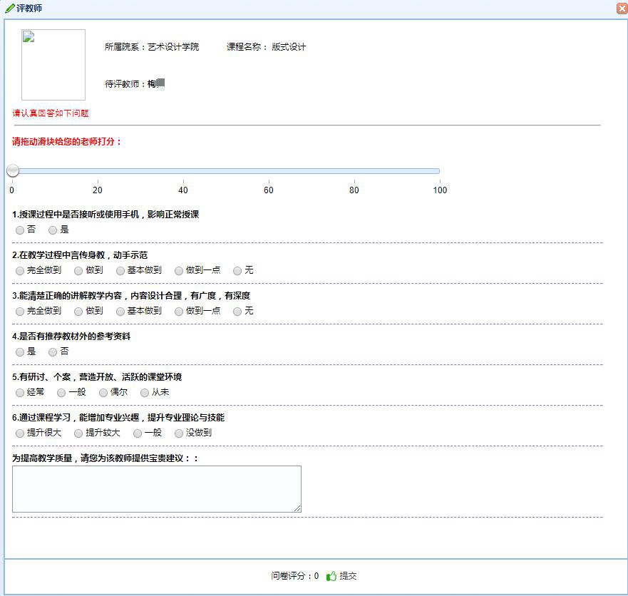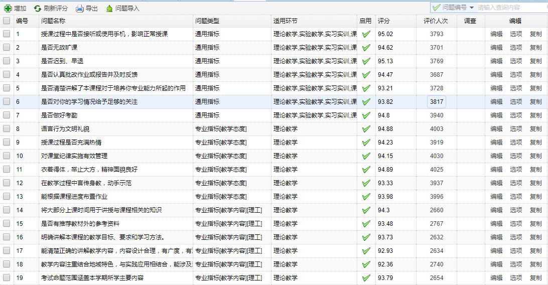 學生(shēng)評教:學生(shēng)進入評教時(shí)系統自(zì)動從(cóng)指标庫中抽®取指标組成評價問(wèn)卷
