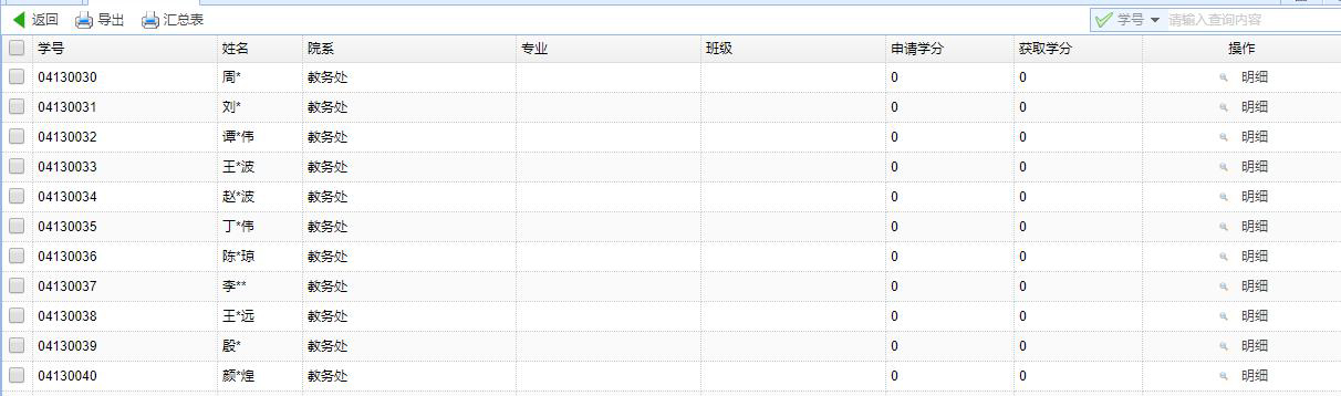 對(duì)創新學分(fēn)的(de)申請(qǐng)情況進行(xíng)統計(jì)查詢: