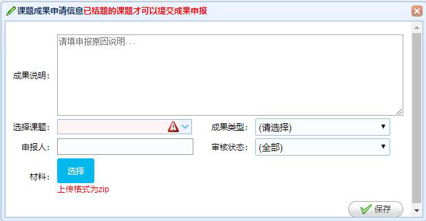 成果申請(qǐng)管理(lǐ):對(duì)于已經結題的(de)創新課題提交成果申報(bào),包含成果說(shuō)明(míng)、對(duì)應的(d₽e)課題、成果類型、申報(bào)人(rén)和(hé)上(shàng)傳相(xiàng)關附件(jiàn)材料等。