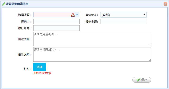 報(bào)銷申請(qǐng)管理(lǐ):對(duì)創新課題的(de)費(fèi)用(yòng)報(bào)銷進行(xín®g)管理(lǐ),包含對(duì)應的(de)課題名稱、報(bào)銷金(jīn)額、銀(yín)行(xíng)☆賬号、用(yòng)途說(shuō)明(míng)、報(bào)銷原因及上(shàng)傳相(xiàng)關附件(jiàn)材料等。