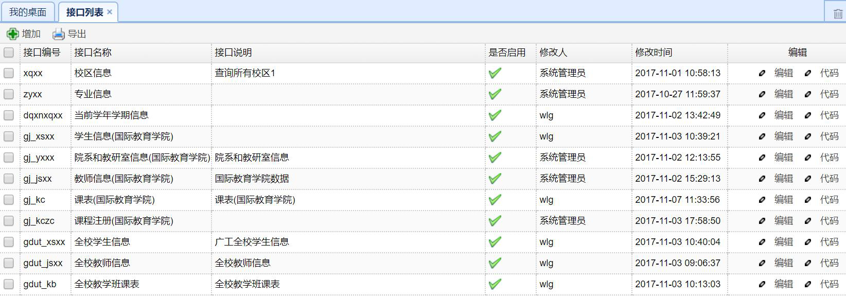 系統提供界面化(huà)的(de)接口定制(zhì)平台,為(wèi)各類接口的(de)定制(zhì)與産生(shēng)提供了(le)方便。非開(kāi)發人(rén)員(yuán)也(yě)可(kě)以根據需求自(zì)定義添加定制(zhì)各種數(shù)據接口,數 (shù)據可(kě)來(lái)源于系統數(shù)據庫中的(de)任意一(yī)張表任意字段,并支持指定接口的(de)調用(yòng)方。