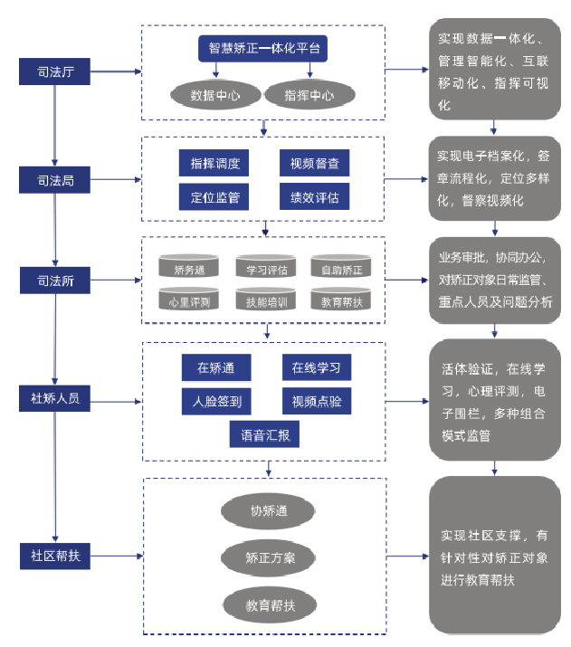 同時(shí)平台以業(yè)務信息化(huà)應用(yòng)與管理(lǐ)制(zhì)度相(xiàng)融合的(de)機(jī)制(zhì),實現(xiàn)社區(qū)矯"正業(yè)務信息 全面化(huà),管理(lǐ)水(shuǐ)平智能(néng)化(huà),社區(qū)矯正工(gōng)作(zuò)便捷化(‍huà),從(cóng)根本上(shàng)解決了(le)城(chéng)鄉(xiāng)基層各 司法所、街(jiē)道(dào)辦人(rén)員(yuán)不§(bù)足,工(gōng)作(zuò)手段少(shǎo),管理(lǐ)措施有(yǒu)限等問(wèn)題,夯實了(le)城(chéngπ)鄉(xiāng)基 層司法服務能(néng)力。